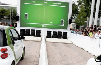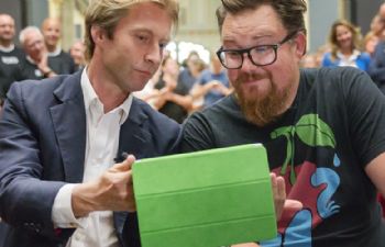 Geen hostessessen, maar studenten. Een complete app rondom de stand. Een opvallend groene groen...