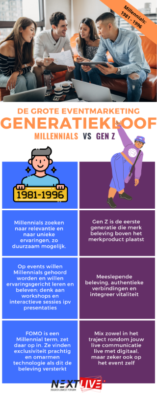 In 4 artikelen neemt NEXTLIVE je, gebaseerd op vele artikelen en onderzoeken, mee in de verschillende generaties, hun voorkeuren en afkeer en hoe je dat vertaalt naar jouw marcom-events. Deel 2 de Generatie y, de Millennials.
