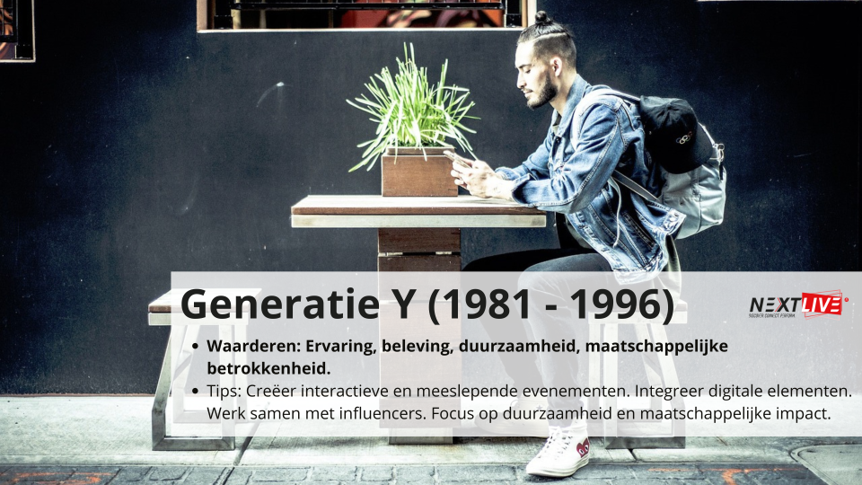 Generatie Y, ook wel Millennials genoemd, zijn geboren tussen 1981 en 1996. Ze zijn de eerste generatie die is opgegroeid met het internet en mobiele technologie. Ze zijn gewend om constant verbonden te zijn en staan open voor nieuwe technologieën. Ze zijn ook individualistisch, ondernemend en maatschappelijk betrokken.