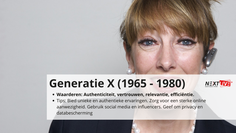 Generatie X, geboren tussen circa 1965 en 1980. Ze zijn opgegroeid met de opkomst van technologie, maar zijn niet zo digitaal als jongere generaties. Ze waarderen authenticiteit en vertrouwen en zijn veeleisende consumenten.