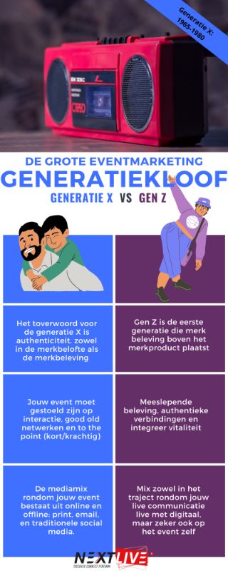 Onze arbeidsmarkt bestaat grofweg uit vier generaties: de babyboomers, generatie x, y en z. Binnen die vier generaties is onze wereld in raptempo veranderd. Dat heeft grote gevolgen voor de marketing en comunicatie van merken, organisaties en bedrijven. Om de verschillende doelgroepen te bereiken, moet je de generatiekloof zien en begrijpen. In 4 artikelen kijkt NEXTLIVE hoe je daar jouw marcom-events op aan moet passen. Deel 2: Generatie X.