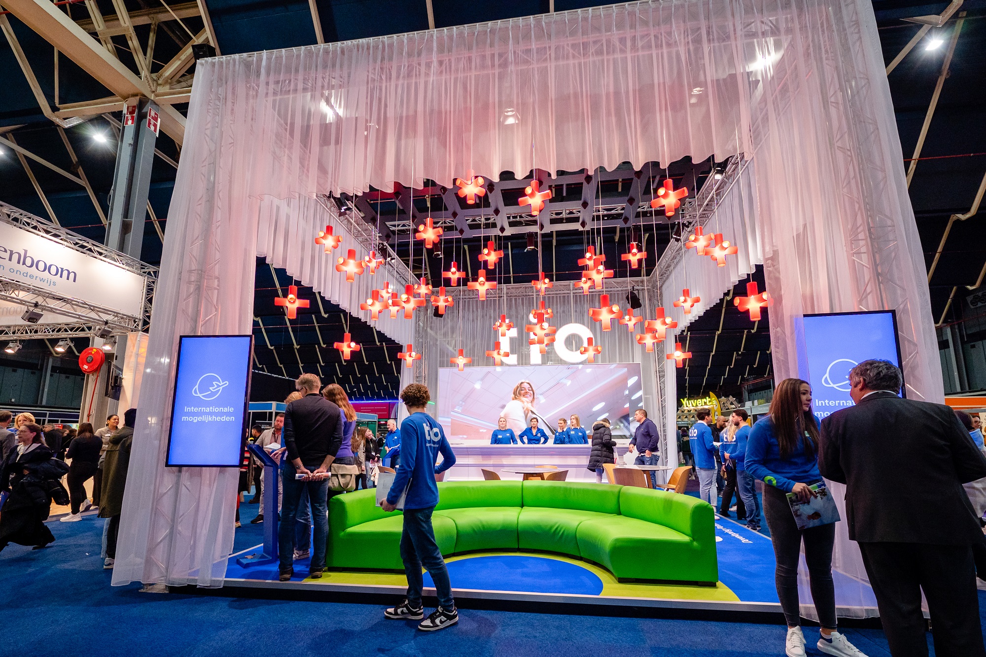 Het concept van de stand van Tio is informeel, visueel en gastvrij. Door middel van een open houding gecombineerd met uitnodigend meubilair (zitjes en een ruime open bank) voelt de stand uitnodigend aan. Door middel van 4 verticale schermen met korte en bondige visuele triggers én 1 groot horizontaal scherm ook direct informerend op een leuke/jeugdige manier. Er is hier goed gekeken naar de doelgroep/Experience. Door middel van met veel Visuals te werken. Ook veel jeugdig 'personeel' met informele houding (lees: studenten).