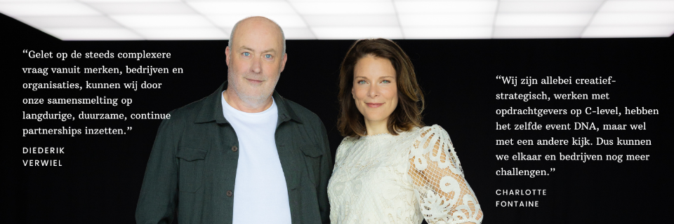 Dat Charlotte Fontaine (Capital C) en Diederik Verwiel (Verwiel – the creative agency) elkaar al door en door kennen, na vele jaren te hebben samengewerkt, bleek de basis voor een dergelijke samensmelting. Zeker als het gaat om twee creatief-strategen, moet je wel min of meer op een zelfde manier naar het vak van LIVE kijken. “Wij hebben hetzelfde event DNA, maar wel met een andere kijk. Dus kunnen we elkaar en onze opdrachtgevers volop uitdagen en zijn we klaar voor de vraag die nu en in de toekomst bij ons neer wordt gelegd.”