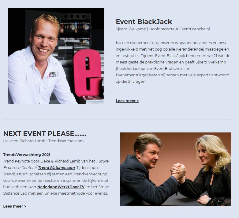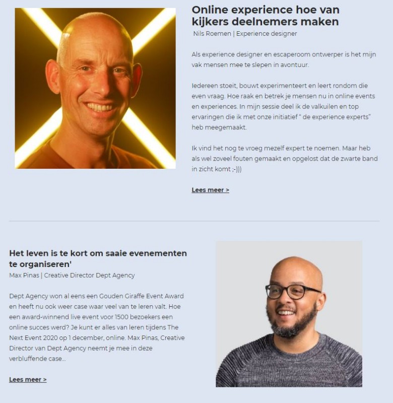 'The Next Event nam de afgelopen jaren al een bijzondere positie in: een kennisbeurs, waar standhouders alleen mochten exposeren op basis van het delen van specifieke kennis. Dus geen vlaggezwaai of logo-plakken, maar kennisdelen. Daarnaast hadden we in de live variant de afgelopen jaren een topprogramma, gericht op noviteiten, kennis en inspiratie om het volgende evenement nog beter te maken. In het voortraject voor de bezoekers was de focus niet op kwantiteit, op aantallen, maar louter op kwaliteit van de bezoeker: opdrachtgevers en bureaus mochten als enige naar binnen als bezoeker. Ook in de online variant van The Next Event op 1 december 2020 is alle kennis opdrachtgever gericht. Even een WC-eend doen: de toegangsprijs voor 49,- euro is het tiendubbel-en-dwars waard!', aldus het team van EventBranche.nl.
