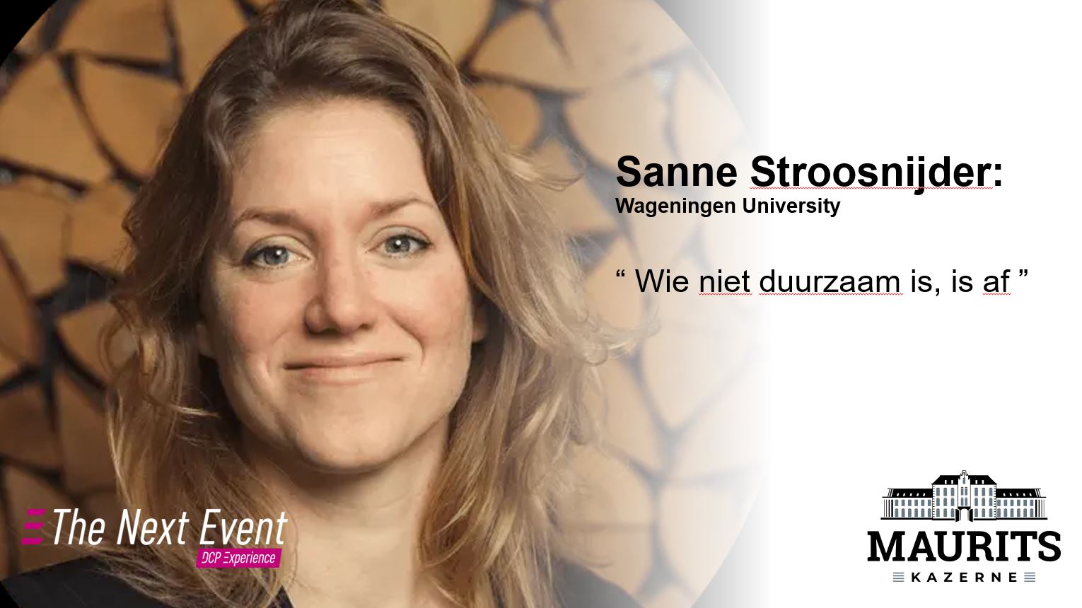 Buffetten kunnen echt niet meer. Sanne Stroosnijder van de Wageningen University & Research is heel stellig in haar presentatie tijdens The Next Event. "Meer dan de helft van buffet-eten wordt weggegooid." Over waste gesproken ... Uit onderzoek blijkt dat in ons land een kwart van al het eten weggegooid wordt. "Dat is jaarlijks een rij vrachtwagens van Amsterdam tot aan Barcelona. Wie nu niet duurzaam is, is af."